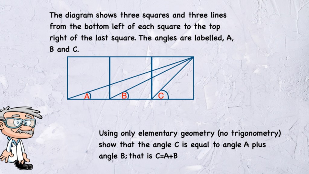 Using Geometry Only. The diagram shows three squares and three lines from the bottom left of each square to the top right of the last square. The angles are labelled, A, B and C. Using only elementary geometry (no trigonometry) show that the angle C is equal to angle A plus angle B; that is A+B=C